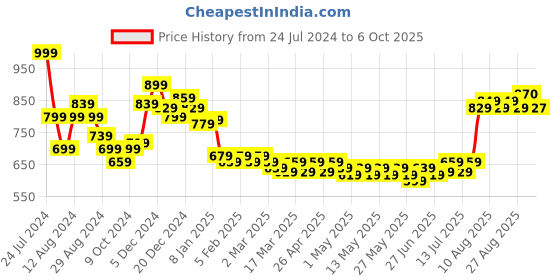 The current price is ₹827, which is ₹228 (38.1%) higher than the best price of ₹599 last seen on 31 May 2025. Over the 439 day price history period, prices have ranged from ₹599 to ₹999, with an average of ₹721. The pricing shows moderate volatility, and the overall trend is favorable for consumers as prices are getting cheaper. In terms of recent activity, there have been 0 price changes this week, 0 this month, and 43 over the past year. If you need this product now, it's a reasonable time to buy as prices are stable, but you might want to monitor for potential better deals.