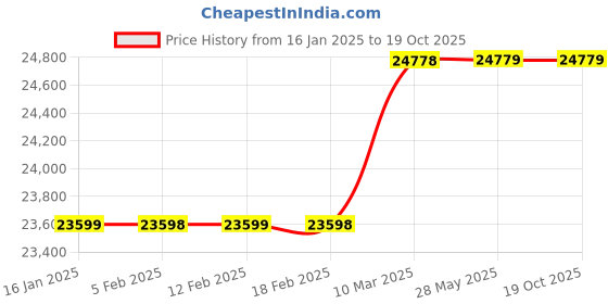 The current price is ₹24,779, which is ₹1,180.18 (5.0%) higher than the best price of ₹23,598.82 last seen on 5 Feb 2025. Over the 275 day price history period, prices have ranged from ₹23,598.82 to ₹24,779, with an average of ₹24,105. The pricing has been quite stable with low volatility, but the overall trend is concerning as prices are getting more expensive. In terms of recent activity, there have been 0 price changes this week, 0 this month, and 5 over the past year. If you need this product now, it's a reasonable time to buy as prices are stable, but you might want to monitor for potential better deals.