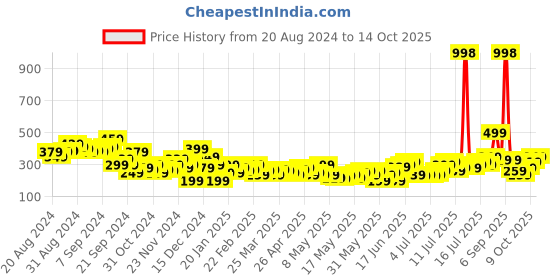 The current price is ₹349, which is ₹150 (75.4%) higher than the best price of ₹199 last seen on 6 Dec 2024. Over the 420 day price history period, prices have ranged from ₹199 to ₹998, with an average of ₹306. The pricing shows high volatility with significant fluctuations, and the overall trend is favorable for consumers as prices are getting cheaper. In terms of recent activity, there have been 0 price changes this week, 4 this month, and 78 over the past year. If you need this product now, it's a reasonable time to buy as prices are stable, but you might want to monitor for potential better deals.
