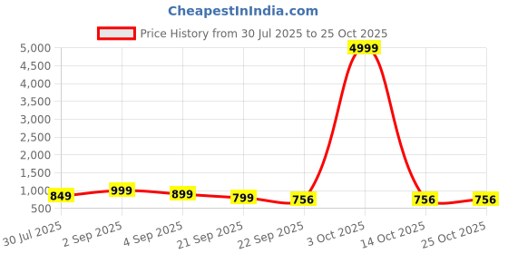 Great news for shoppers! The current price of ₹756 is at its best ever level. Over the 86 day price history period, prices have ranged from ₹756 to ₹4,999, with an average of ₹1,352. The pricing shows high volatility with significant fluctuations, and the overall trend is favorable for consumers as prices are getting cheaper. In terms of recent activity, there have been 0 price changes this week, 1 this month, and 6 over the past year. This is an excellent time to make a purchase as prices are trending downward and conditions appear favorable.