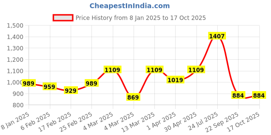 The current price is ₹884, which is ₹15 (1.7%) higher than the best price of ₹869 last seen on 4 Mar 2025. Over the 281 day price history period, prices have ranged from ₹869 to ₹1,407, with an average of ₹1,021. The pricing shows moderate volatility, and the overall trend is favorable for consumers as prices are getting cheaper. In terms of recent activity, there have been 0 price changes this week, 0 this month, and 10 over the past year. This is an excellent time to make a purchase as prices are trending downward and conditions appear favorable.