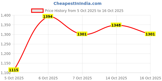 The current price is ₹1,301, which is ₹186 (16.7%) higher than the best price of ₹1,115 last seen on 5 Oct 2025. Over the 11 day price history period, prices have ranged from ₹1,115 to ₹1,394, with an average of ₹1,292. The pricing shows moderate volatility, but the overall trend is concerning as prices are getting more expensive. In terms of recent activity, there has been 1 price change this week, 4 this month, and 4 over the past year. If you need this product now, it's a reasonable time to buy as prices are stable, but you might want to monitor for potential better deals.