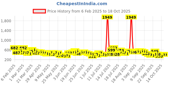 The current price is ₹409, which is ₹78 (23.6%) higher than the best price of ₹331 last seen on 1 Jul 2025. Over the 254 day price history period, prices have ranged from ₹331 to ₹1,949, with an average of ₹520. The pricing shows high volatility with significant fluctuations, and the overall trend is favorable for consumers as prices are getting cheaper. In terms of recent activity, there has been 1 price change this week, 6 this month, and 68 over the past year. If you need this product now, it's a reasonable time to buy as prices are stable, but you might want to monitor for potential better deals.