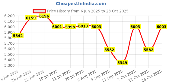 The current price is ₹6,003, which is ₹654 (12.2%) higher than the best price of ₹5,349 last seen on 17 Sep 2025. Over the 139 day price history period, prices have ranged from ₹5,349 to ₹6,196, with an average of ₹5,894. The pricing has been quite stable with low volatility, with prices remaining relatively stable overall. In terms of recent activity, there have been 0 price changes this week, 2 this month, and 11 over the past year. If you need this product now, it's a reasonable time to buy as prices are stable, but you might want to monitor for potential better deals.