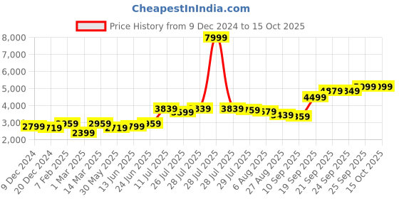 The current price is ₹5,099, which is ₹2,700 (112.5%) higher than the best price of ₹2,399 last seen on 1 Mar 2025. Over the 309 day price history period, prices have ranged from ₹2,399 to ₹7,999, with an average of ₹3,822. The pricing shows high volatility with significant fluctuations, but the overall trend is concerning as prices are getting more expensive. In terms of recent activity, there have been 0 price changes this week, 3 this month, and 20 over the past year. Consider waiting before making a purchase as prices are rising and better deals may be available later.