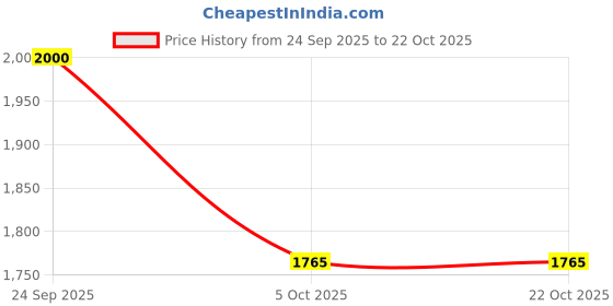 Fantastic! The current price of ₹1,765 is at its best ever level. Over the 27 day price history period, prices have ranged from ₹1,765 to ₹2,000, with an average of ₹1,843. The pricing shows moderate volatility, and the overall trend is favorable for consumers as prices are getting cheaper. In terms of recent activity, there have been 0 price changes this week, 1 this month, and 1 over the past year. This is an excellent time to make a purchase as prices are trending downward and conditions appear favorable.