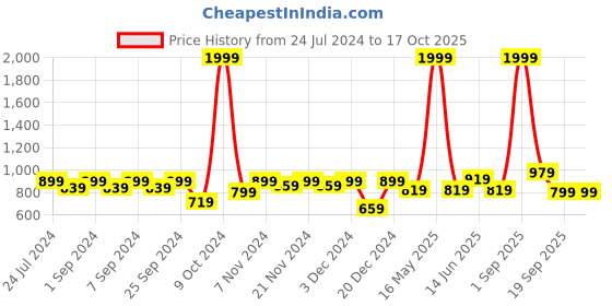 The current price is ₹799, which is ₹140 (21.2%) higher than the best price of ₹659 last seen on 7 Dec 2024. Over the 449 day price history period, prices have ranged from ₹659 to ₹1,999, with an average of ₹983. The pricing shows high volatility with significant fluctuations, and the overall trend is favorable for consumers as prices are getting cheaper. In terms of recent activity, there have been 0 price changes this week, 1 this month, and 15 over the past year. This is an excellent time to make a purchase as prices are trending downward and conditions appear favorable.