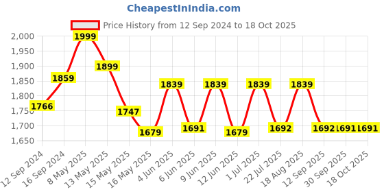 The current price is ₹1,691.88, which is ₹12.88 (0.8%) higher than the best price of ₹1,679 last seen on 16 May 2025. Over the 401 day price history period, prices have ranged from ₹1,679 to ₹1,999, with an average of ₹1,778. The pricing shows moderate volatility, with prices remaining relatively stable overall. In terms of recent activity, there have been 0 price changes this week, 0 this month, and 12 over the past year. If you need this product now, it's a reasonable time to buy as prices are stable, but you might want to monitor for potential better deals.