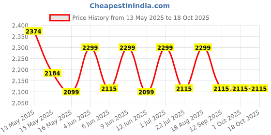 The current price is ₹2,115.08, which is ₹16.08 (0.8%) higher than the best price of ₹2,099 last seen on 16 May 2025. Over the 158 day price history period, prices have ranged from ₹2,099 to ₹2,374.05, with an average of ₹2,194. The pricing has been quite stable with low volatility, and the overall trend is favorable for consumers as prices are getting cheaper. In terms of recent activity, there have been 0 price changes this week, 0 this month, and 11 over the past year. If you need this product now, it's a reasonable time to buy as prices are stable, but you might want to monitor for potential better deals.