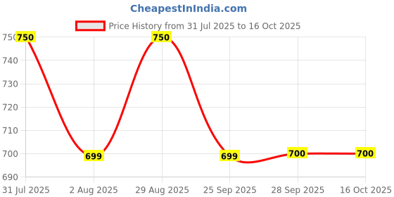 The current price is ₹700, which is ₹1 (0.1%) higher than the best price of ₹699 last seen on 2 Aug 2025. Over the 77 day price history period, prices have ranged from ₹699 to ₹750, with an average of ₹716. The pricing has been quite stable with low volatility, and the overall trend is favorable for consumers as prices are getting cheaper. In terms of recent activity, there have been 0 price changes this week, 1 this month, and 4 over the past year. If you need this product now, it's a reasonable time to buy as prices are stable, but you might want to monitor for potential better deals.