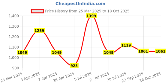 The current price is ₹1,061, which is ₹138 (15.0%) higher than the best price of ₹923 last seen on 26 Apr 2025. Over the 207 day price history period, prices have ranged from ₹923 to ₹1,399, with an average of ₹1,108. The pricing shows moderate volatility, with prices remaining relatively stable overall. In terms of recent activity, there have been 0 price changes this week, 0 this month, and 7 over the past year. If you need this product now, it's a reasonable time to buy as prices are stable, but you might want to monitor for potential better deals.