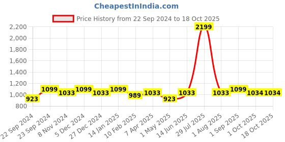 The current price is ₹1,034, which is ₹111 (12.0%) higher than the best price of ₹923 last seen on 22 Sep 2024. Over the 391 day price history period, prices have ranged from ₹923 to ₹2,199, with an average of ₹1,111. The pricing shows high volatility with significant fluctuations, but the overall trend is concerning as prices are getting more expensive. In terms of recent activity, there have been 0 price changes this week, 0 this month, and 11 over the past year. If you need this product now, it's a reasonable time to buy as prices are stable, but you might want to monitor for potential better deals.