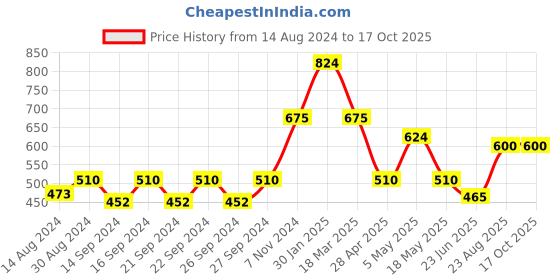 The current price is ₹600, which is ₹148 (32.7%) higher than the best price of ₹452 last seen on 14 Sep 2024. Over the 428 day price history period, prices have ranged from ₹452 to ₹824, with an average of ₹550. The pricing shows high volatility with significant fluctuations, but the overall trend is concerning as prices are getting more expensive. In terms of recent activity, there have been 0 price changes this week, 0 this month, and 7 over the past year. Consider waiting before making a purchase as prices are rising and better deals may be available later.
