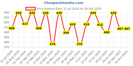 The current price is ₹407, which is ₹30.96 (8.2%) higher than the best price of ₹376.04 last seen on 19 Nov 2024. Over the 444 day price history period, prices have ranged from ₹376.04 to ₹439.45, with an average of ₹416. The pricing has been quite stable with low volatility, with prices remaining relatively stable overall. In terms of recent activity, there have been 0 price changes this week, 0 this month, and 11 over the past year. If you need this product now, it's a reasonable time to buy as prices are stable, but you might want to monitor for potential better deals.