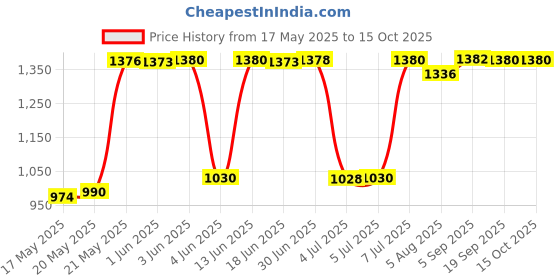 The current price is ₹1,380, which is ₹406 (41.7%) higher than the best price of ₹974 last seen on 17 May 2025. Over the 150 day price history period, prices have ranged from ₹974 to ₹1,382, with an average of ₹1,261. The pricing shows moderate volatility, but the overall trend is concerning as prices are getting more expensive. In terms of recent activity, there have been 0 price changes this week, 0 this month, and 14 over the past year. If you need this product now, it's a reasonable time to buy as prices are stable, but you might want to monitor for potential better deals.
