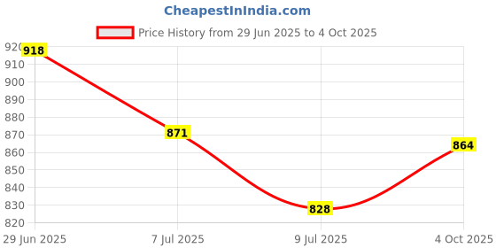 The current price is ₹864, which is ₹36 (4.3%) higher than the best price of ₹828 last seen on 9 Jul 2025. Over the 97 day price history period, prices have ranged from ₹828 to ₹918, with an average of ₹870. The pricing has been quite stable with low volatility, and the overall trend is favorable for consumers as prices are getting cheaper. In terms of recent activity, there have been 0 price changes this week, 0 this month, and 3 over the past year. If you need this product now, it's a reasonable time to buy as prices are stable, but you might want to monitor for potential better deals.