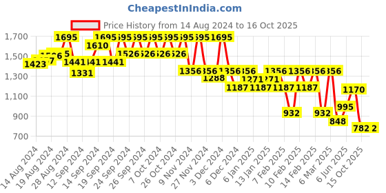 Awesome! The current price of ₹782 is at its best ever level. Over the 427 day price history period, prices have ranged from ₹782 to ₹1,695, with an average of ₹1,373. The pricing shows high volatility with significant fluctuations, and the overall trend is favorable for consumers as prices are getting cheaper. In terms of recent activity, there have been 0 price changes this week, 0 this month, and 24 over the past year. This is an excellent time to make a purchase as prices are trending downward and conditions appear favorable.