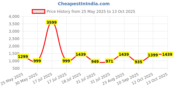 The current price is ₹1,439, which is ₹504 (53.9%) higher than the best price of ₹935 last seen on 10 Sep 2025. Over the 141 day price history period, prices have ranged from ₹935 to ₹3,599, with an average of ₹1,406. The pricing shows high volatility with significant fluctuations, but the overall trend is concerning as prices are getting more expensive. In terms of recent activity, there has been 1 price change this week, 1 this month, and 10 over the past year. Consider waiting before making a purchase as prices are rising and better deals may be available later.