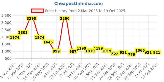 The current price is ₹921, which is ₹145 (18.7%) higher than the best price of ₹776 last seen on 23 Sep 2025. Over the 230 day price history period, prices have ranged from ₹776 to ₹3,290, with an average of ₹1,463. The pricing shows high volatility with significant fluctuations, and the overall trend is favorable for consumers as prices are getting cheaper. In terms of recent activity, there have been 0 price changes this week, 4 this month, and 16 over the past year. This is an excellent time to make a purchase as prices are trending downward and conditions appear favorable.