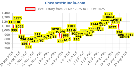 The current price is ₹898, which is ₹275 (44.1%) higher than the best price of ₹623 last seen on 5 May 2025. Over the 207 day price history period, prices have ranged from ₹623 to ₹1,376, with an average of ₹964. The pricing shows high volatility with significant fluctuations, and the overall trend is favorable for consumers as prices are getting cheaper. In terms of recent activity, there have been 0 price changes this week, 3 this month, and 65 over the past year. If you need this product now, it's a reasonable time to buy as prices are stable, but you might want to monitor for potential better deals.