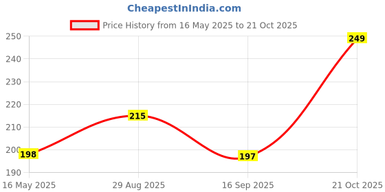 The current price is ₹249, which is ₹52 (26.4%) higher than the best price of ₹197 last seen on 16 Sep 2025. Over the 158 day price history period, prices have ranged from ₹197 to ₹249, with an average of ₹215. The pricing shows moderate volatility, but the overall trend is concerning as prices are getting more expensive. In terms of recent activity, there have been 0 price changes this week, 0 this month, and 3 over the past year. If you need this product now, it's a reasonable time to buy as prices are stable, but you might want to monitor for potential better deals.