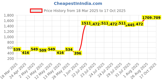 The current price is ₹1,709, which is ₹1,313 (331.6%) higher than the best price of ₹396 last seen on 1 Jun 2025. Over the 212 day price history period, prices have ranged from ₹396 to ₹1,709, with an average of ₹1,042. The pricing shows high volatility with significant fluctuations, but the overall trend is concerning as prices are getting more expensive. In terms of recent activity, there have been 0 price changes this week, 0 this month, and 15 over the past year. Consider waiting before making a purchase as prices are rising and better deals may be available later.