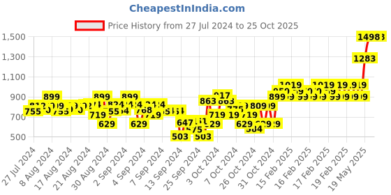 The current price is ₹1,498, which is ₹995 (197.8%) higher than the best price of ₹503 last seen on 13 Sep 2024. Over the 454 day price history period, prices have ranged from ₹503 to ₹1,498, with an average of ₹828. The pricing shows high volatility with significant fluctuations, but the overall trend is concerning as prices are getting more expensive. In terms of recent activity, there have been 0 price changes this week, 0 this month, and 27 over the past year. Consider waiting before making a purchase as prices are rising and better deals may be available later.
