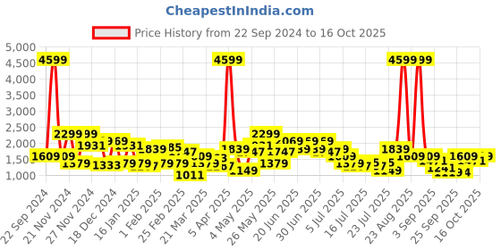 The current price is ₹1,609, which is ₹598 (59.1%) higher than the best price of ₹1,011 last seen on 2 Mar 2025. Over the 389 day price history period, prices have ranged from ₹1,011 to ₹4,599, with an average of ₹1,825. The pricing shows high volatility with significant fluctuations, with prices remaining relatively stable overall. In terms of recent activity, there has been 1 price change this week, 5 this month, and 56 over the past year. If you need this product now, it's a reasonable time to buy as prices are stable, but you might want to monitor for potential better deals.