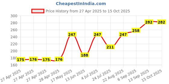 The current price is ₹282, which is ₹106.18 (60.4%) higher than the best price of ₹175.82 last seen on 27 Apr 2025. Over the 170 day price history period, prices have ranged from ₹175.82 to ₹282, with an average of ₹222. The pricing shows high volatility with significant fluctuations, but the overall trend is concerning as prices are getting more expensive. In terms of recent activity, there have been 0 price changes this week, 0 this month, and 10 over the past year. If you need this product now, it's a reasonable time to buy as prices are stable, but you might want to monitor for potential better deals.