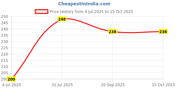 The current price is ₹238, which is ₹38 (19.0%) higher than the best price of ₹200 last seen on 4 Jul 2025. Over the 102 day price history period, prices have ranged from ₹200 to ₹248, with an average of ₹231. The pricing shows moderate volatility, but the overall trend is concerning as prices are getting more expensive. In terms of recent activity, there have been 0 price changes this week, 0 this month, and 2 over the past year. If you need this product now, it's a reasonable time to buy as prices are stable, but you might want to monitor for potential better deals.