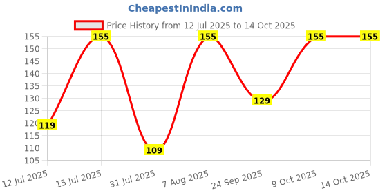 The current price is ₹155, which is ₹46 (42.2%) higher than the best price of ₹109 last seen on 31 Jul 2025. Over the 93 day price history period, prices have ranged from ₹109 to ₹155, with an average of ₹140. The pricing shows moderate volatility, but the overall trend is concerning as prices are getting more expensive. In terms of recent activity, there have been 0 price changes this week, 1 this month, and 5 over the past year. If you need this product now, it's a reasonable time to buy as prices are stable, but you might want to monitor for potential better deals.