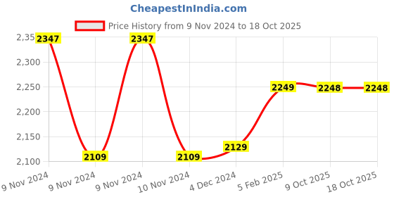 The current price is ₹2,248, which is ₹139 (6.6%) higher than the best price of ₹2,109 last seen on 9 Nov 2024. Over the 343 day price history period, prices have ranged from ₹2,109 to ₹2,347, with an average of ₹2,223. The pricing has been quite stable with low volatility, with prices remaining relatively stable overall. In terms of recent activity, there have been 0 price changes this week, 0 this month, and 6 over the past year. If you need this product now, it's a reasonable time to buy as prices are stable, but you might want to monitor for potential better deals.