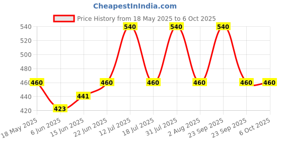 The current price is ₹460, which is ₹37 (8.7%) higher than the best price of ₹423 last seen on 6 Jun 2025. Over the 140 day price history period, prices have ranged from ₹423 to ₹540, with an average of ₹477. The pricing shows moderate volatility, with prices remaining relatively stable overall. In terms of recent activity, there have been 0 price changes this week, 1 this month, and 9 over the past year. If you need this product now, it's a reasonable time to buy as prices are stable, but you might want to monitor for potential better deals.
