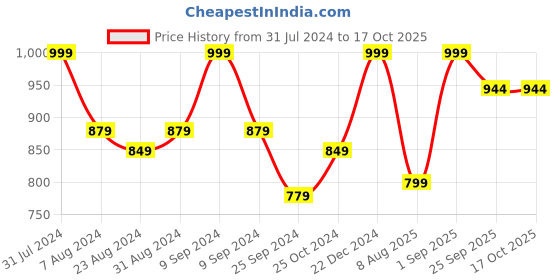 The current price is ₹944, which is ₹165 (21.2%) higher than the best price of ₹779 last seen on 25 Sep 2024. Over the 442 day price history period, prices have ranged from ₹779 to ₹999, with an average of ₹907. The pricing shows moderate volatility, and the overall trend is favorable for consumers as prices are getting cheaper. In terms of recent activity, there have been 0 price changes this week, 0 this month, and 4 over the past year. If you need this product now, it's a reasonable time to buy as prices are stable, but you might want to monitor for potential better deals.