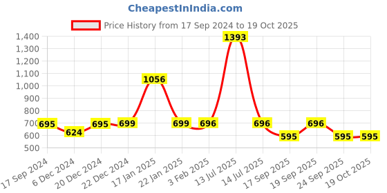 Great news for shoppers! The current price of ₹595 is at its best ever level. Over the 396 day price history period, prices have ranged from ₹595 to ₹1,393, with an average of ₹749. The pricing shows high volatility with significant fluctuations, and the overall trend is favorable for consumers as prices are getting cheaper. In terms of recent activity, there have been 0 price changes this week, 1 this month, and 10 over the past year. This is an excellent time to make a purchase as prices are trending downward and conditions appear favorable.