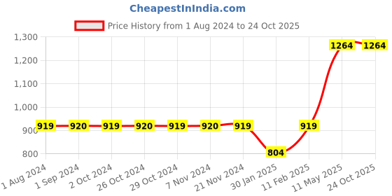 The current price is ₹1,264, which is ₹460 (57.2%) higher than the best price of ₹804 last seen on 30 Jan 2025. Over the 449 day price history period, prices have ranged from ₹804 to ₹1,264, with an average of ₹972. The pricing shows moderate volatility, but the overall trend is concerning as prices are getting more expensive. In terms of recent activity, there have been 0 price changes this week, 0 this month, and 6 over the past year. Consider waiting before making a purchase as prices are rising and better deals may be available later.