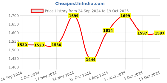 The current price is ₹1,597, which is ₹153 (10.6%) higher than the best price of ₹1,444 last seen on 12 Dec 2024. Over the 389 day price history period, prices have ranged from ₹1,444 to ₹1,699, with an average of ₹1,582. The pricing has been quite stable with low volatility, with prices remaining relatively stable overall. In terms of recent activity, there have been 0 price changes this week, 0 this month, and 5 over the past year. The price direction is uncertain, so monitor the situation for a few more days before making a decision.