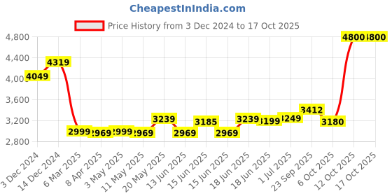 The current price is ₹4,800, which is ₹1,831 (61.7%) higher than the best price of ₹2,969 last seen on 8 Apr 2025. Over the 317 day price history period, prices have ranged from ₹2,969 to ₹4,800, with an average of ₹3,444. The pricing shows high volatility with significant fluctuations, but the overall trend is concerning as prices are getting more expensive. In terms of recent activity, there have been 0 price changes this week, 2 this month, and 15 over the past year. Consider waiting before making a purchase as prices are rising and better deals may be available later.