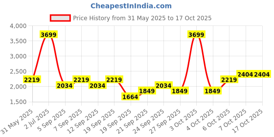 The current price is ₹2,404, which is ₹740 (44.5%) higher than the best price of ₹1,664 last seen on 19 Sep 2025. Over the 138 day price history period, prices have ranged from ₹1,664 to ₹3,699, with an average of ₹2,293. The pricing shows high volatility with significant fluctuations, but the overall trend is concerning as prices are getting more expensive. In terms of recent activity, there have been 0 price changes this week, 8 this month, and 13 over the past year. Consider waiting before making a purchase as prices are rising and better deals may be available later.