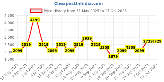The current price is ₹2,729, which is ₹1,050 (62.5%) higher than the best price of ₹1,679 last seen on 19 Sep 2025. Over the 138 day price history period, prices have ranged from ₹1,679 to ₹4,199, with an average of ₹2,470. The pricing shows high volatility with significant fluctuations, but the overall trend is concerning as prices are getting more expensive. In terms of recent activity, there have been 0 price changes this week, 4 this month, and 15 over the past year. Consider waiting before making a purchase as prices are rising and better deals may be available later.