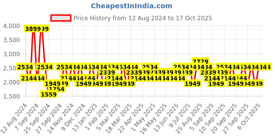 The current price is ₹2,534, which is ₹975 (62.5%) higher than the best price of ₹1,559 last seen on 25 Sep 2024. Over the 430 day price history period, prices have ranged from ₹1,559 to ₹3,899, with an average of ₹2,317. The pricing shows high volatility with significant fluctuations, with prices remaining relatively stable overall. In terms of recent activity, there have been 0 price changes this week, 7 this month, and 49 over the past year. The price direction is uncertain, so monitor the situation for a few more days before making a decision.