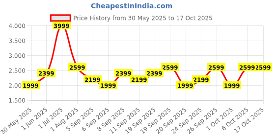 The current price is ₹2,599, which is ₹600 (30.0%) higher than the best price of ₹1,999 last seen on 30 May 2025. Over the 139 day price history period, prices have ranged from ₹1,999 to ₹3,999, with an average of ₹2,424. The pricing shows high volatility with significant fluctuations, but the overall trend is concerning as prices are getting more expensive. In terms of recent activity, there have been 0 price changes this week, 6 this month, and 14 over the past year. Consider waiting before making a purchase as prices are rising and better deals may be available later.
