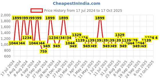 The current price is ₹1,234, which is ₹475 (62.6%) higher than the best price of ₹759 last seen on 25 Sep 2024. Over the 456 day price history period, prices have ranged from ₹759 to ₹1,899, with an average of ₹1,219. The pricing shows high volatility with significant fluctuations, but the overall trend is concerning as prices are getting more expensive. In terms of recent activity, there have been 0 price changes this week, 5 this month, and 30 over the past year. If you need this product now, it's a reasonable time to buy as prices are stable, but you might want to monitor for potential better deals.