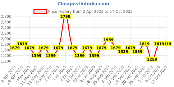 The current price is ₹1,819, which is ₹560 (44.5%) higher than the best price of ₹1,259 last seen on 1 Oct 2025. Over the 197 day price history period, prices have ranged from ₹1,259 to ₹2,799, with an average of ₹1,685. The pricing shows high volatility with significant fluctuations, but the overall trend is concerning as prices are getting more expensive. In terms of recent activity, there have been 0 price changes this week, 4 this month, and 20 over the past year. Consider waiting before making a purchase as prices are rising and better deals may be available later.