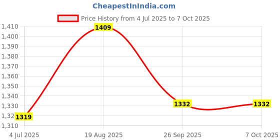 The current price is ₹1,332, which is ₹13 (1.0%) higher than the best price of ₹1,319 last seen on 4 Jul 2025. Over the 94 day price history period, prices have ranged from ₹1,319 to ₹1,409, with an average of ₹1,348. The pricing has been quite stable with low volatility, with prices remaining relatively stable overall. In terms of recent activity, there have been 0 price changes this week, 0 this month, and 2 over the past year. If you need this product now, it's a reasonable time to buy as prices are stable, but you might want to monitor for potential better deals.