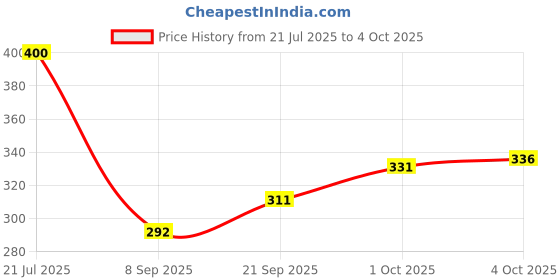 The current price is ₹336, which is ₹44 (15.1%) higher than the best price of ₹292 last seen on 8 Sep 2025. Over the 75 day price history period, prices have ranged from ₹292 to ₹400, with an average of ₹334. The pricing shows moderate volatility, and the overall trend is favorable for consumers as prices are getting cheaper. In terms of recent activity, there has been 1 price change this week, 3 this month, and 4 over the past year. If you need this product now, it's a reasonable time to buy as prices are stable, but you might want to monitor for potential better deals.