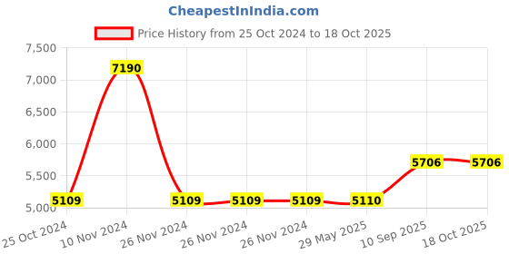 The current price is ₹5,706, which is ₹597 (11.7%) higher than the best price of ₹5,109 last seen on 26 Nov 2024. Over the 358 day price history period, prices have ranged from ₹5,109 to ₹7,190, with an average of ₹5,519. The pricing shows moderate volatility, but the overall trend is concerning as prices are getting more expensive. In terms of recent activity, there have been 0 price changes this week, 0 this month, and 6 over the past year. Consider waiting before making a purchase as prices are rising and better deals may be available later.
