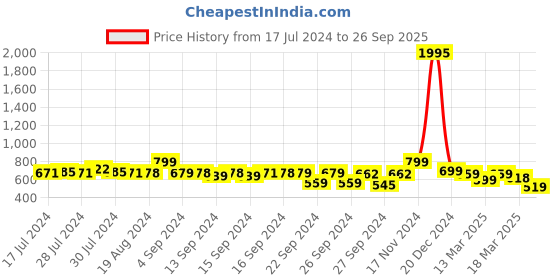 Awesome! The current price of ₹519 is at its best ever level. Over the 436 day price history period, prices have ranged from ₹519 to ₹1,995, with an average of ₹705. The pricing shows high volatility with significant fluctuations, and the overall trend is favorable for consumers as prices are getting cheaper. In terms of recent activity, there have been 0 price changes this week, 0 this month, and 7 over the past year. This is an excellent time to make a purchase as prices are trending downward and conditions appear favorable.