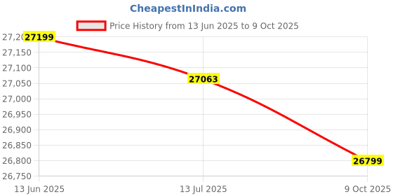 Awesome! The current price of ₹26,799 is at its best ever level. Over the 118 day price history period, prices have ranged from ₹26,799 to ₹27,199, with an average of ₹27,020. The pricing has been quite stable with low volatility, with prices remaining relatively stable overall. In terms of recent activity, there have been 0 price changes this week, 0 this month, and 2 over the past year. The price direction is uncertain, so monitor the situation for a few more days before making a decision.