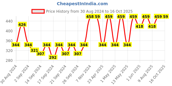 The current price is ₹459, which is ₹167 (57.2%) higher than the best price of ₹292 last seen on 17 Sep 2024. Over the 412 day price history period, prices have ranged from ₹292 to ₹459, with an average of ₹383. The pricing shows high volatility with significant fluctuations, but the overall trend is concerning as prices are getting more expensive. In terms of recent activity, there have been 0 price changes this week, 0 this month, and 11 over the past year. If you need this product now, it's a reasonable time to buy as prices are stable, but you might want to monitor for potential better deals.